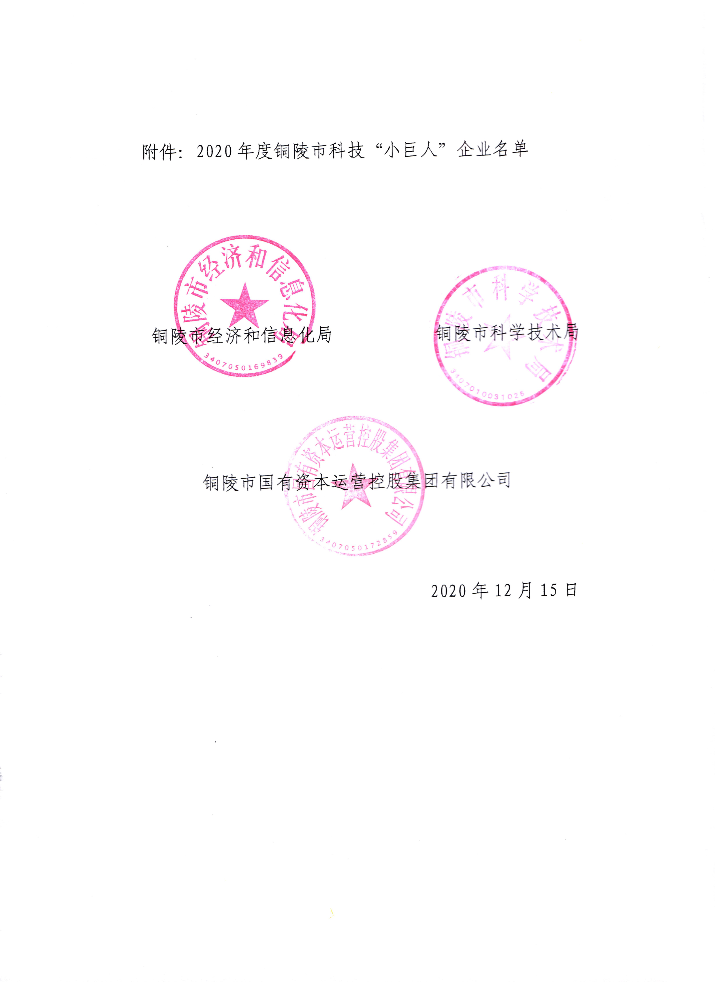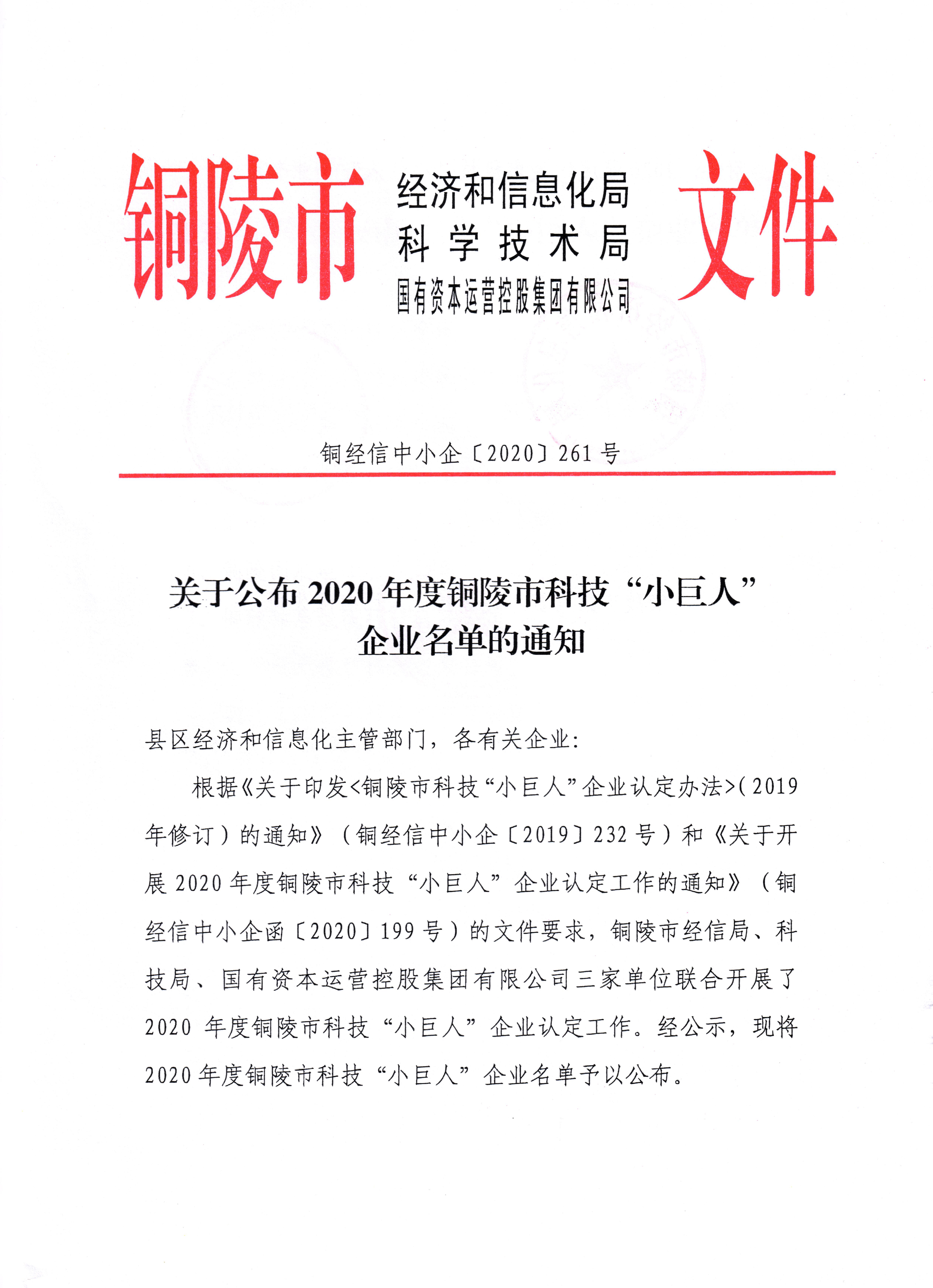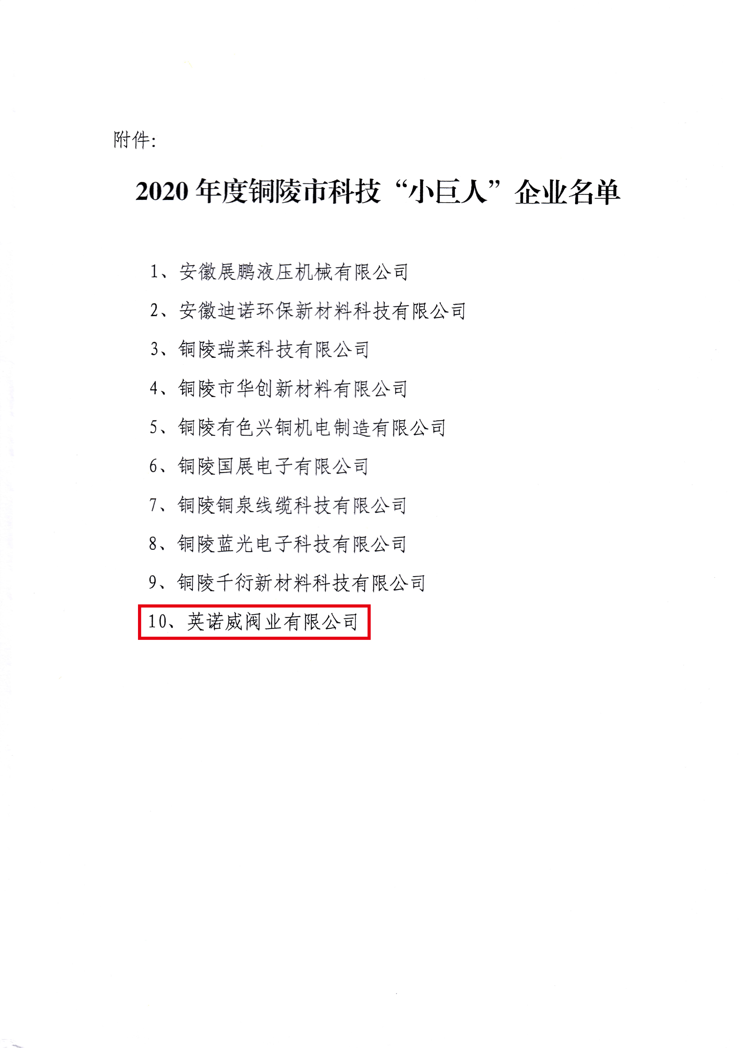 由銅陵市經(jīng)信局、科技局、發(fā)展投資集團(tuán)公司三家單位聯(lián)合開(kāi)展的2020年度銅陵市“科技小巨人”企業(yè)認(rèn)定工作,銅都流體子公司英諾威閥業(yè)有限公司榜上有名。