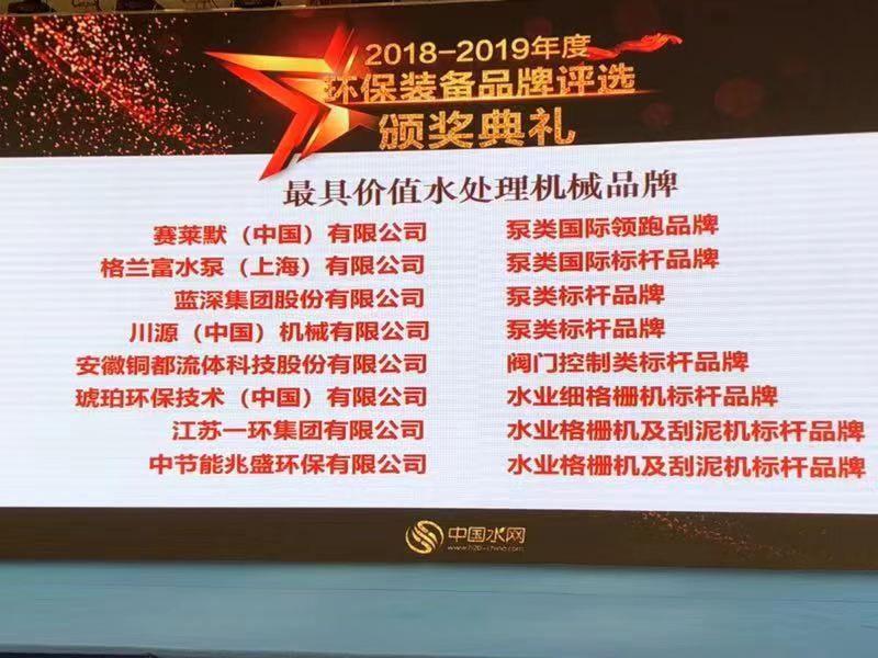2019年8月17日,在上海舉辦的“2019(第十一屆)上海水業(yè)熱點(diǎn)論壇”暨“2018-2019年度價(jià)值環(huán)保裝備品牌”評(píng)選中,安徽銅都流體科技股份有限公司再次榮獲“2018-2019年度價(jià)值水處理機(jī)械品牌”。