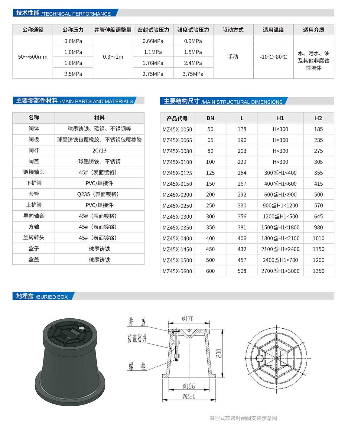 直埋式軟密封閘閥由閥門、地埋裝置(包括伸縮桿、伸縮護(hù)套、地埋盒)等部分組成。其閥門部分除了具有軟密封閘閥的所有特點(diǎn)之外,還具備先進(jìn)的烤漆層防腐技術(shù),閥體不會生銹,確保三十年免維護(hù)。由于軟密封閘閥使用壽命長,性能穩(wěn)定,在軟密封閘閥基礎(chǔ)上添加了一個伸縮桿、伸縮護(hù)套,并配以地埋盒,形成直埋式軟密封閘閥,特點(diǎn)如下: