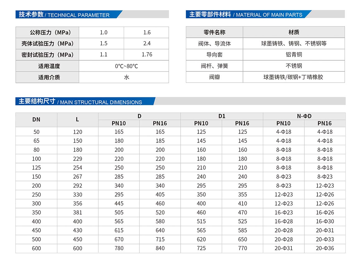 HC42X靜音式止回閥由閥體、閥座、導(dǎo)流體、閥瓣、軸瓦及彈簧等零件組成。內(nèi)部流道采用流線型設(shè)計,壓力損失小,閥瓣啟閉行程很短,停泵時可快速關(guān)閉,防止巨大的水錘聲,形成靜音效果。該閥主要用于給水、排水、消防、暖通系統(tǒng),可安裝于水泵出口處,能夠防止介質(zhì)倒流,達(dá)到保護(hù)水泵及管道目的。
